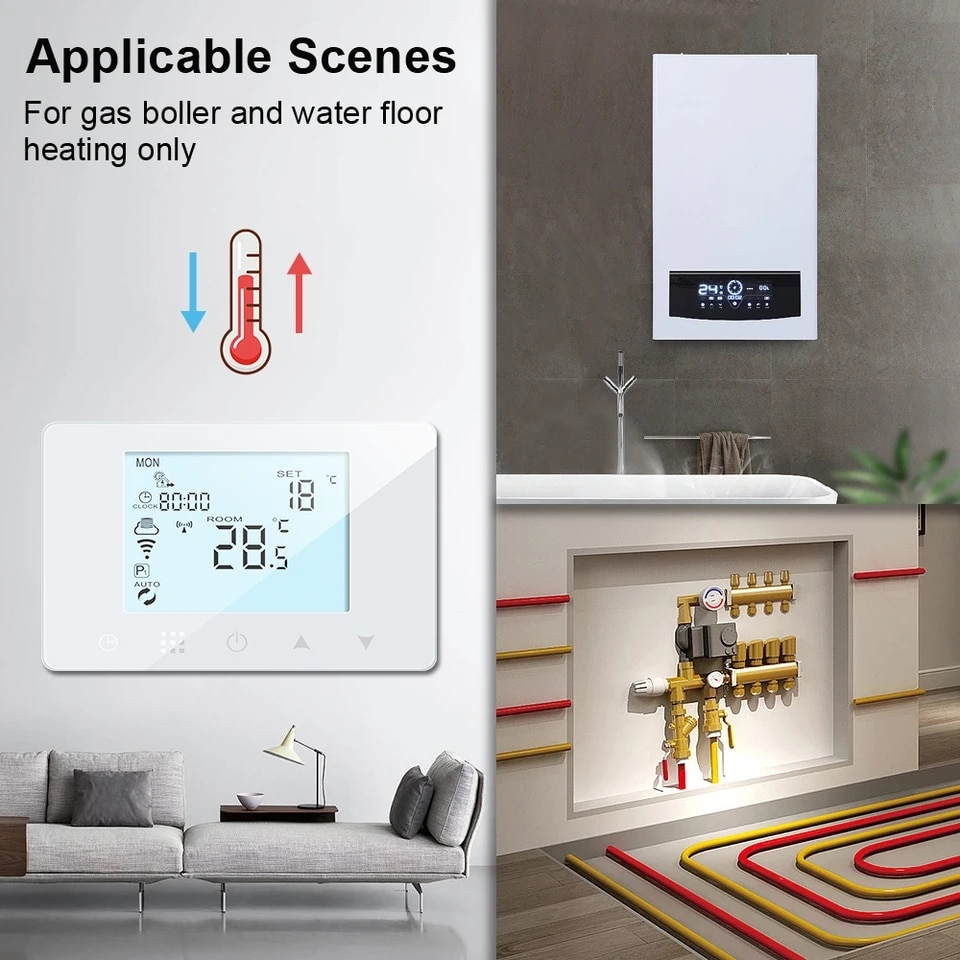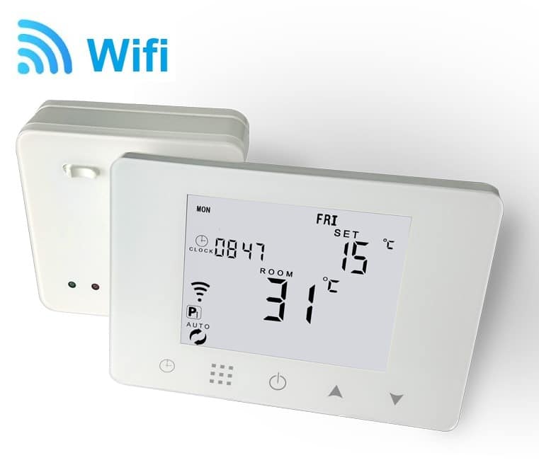 Ekraaniga termostaat / temperatuuri regulaatori (patareitoitel) saab paigaldada kas lauale või seinale ja juhtmevabalt lülitab ta eraldiseisva lülitusseadme abil meie soovitud kütteseadmeid sisse või välja. Ühe lülitusseadme järel võib olla kokku kuni 2,5kW / 230V kütteseadmeid. Lülituseadmeid võib ühe termostaadi järel olla ka mitu. Jutmevaba temperatuuri reguleerimine on telefonist seadistatav Tuya “Smart Life” äppi kasutades.
