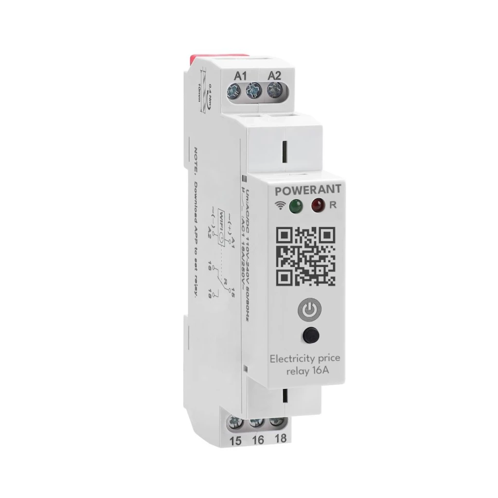 Powerant elektri börsihinda jälgiv nutirelee 16A. Elektri hinna relee abil saab teostada koormuse juhtimist nii, et elekter lülitub automaatselt sisse ajal, mil elektri hind on kõige soodsam. Suure säästu annab juba see kui väldime kasvõi paari kõige kallima elektrihinnaga tundi päevas. Powerant börsihinna relee paigaldatakse küttekeha, näiteks elektriradiaatori / boileri ette (relee maksimaalne koormus 16 A). Elektrikilbi DIN-liist kinnitusega. Powerant nutirelee peab olema ühendatud kohaliku WiFi võrguga. Elektri hina jälgiv relee töötab kõikides Euroopa riikides. Toetab 15 minuti arvestust