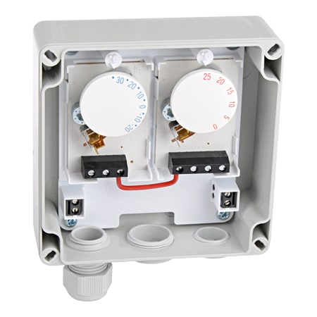 Ränninlämmityksen bimetallitermostaatti Eberle DTR-E 3102 – jään ja lumen sulattamiseen katoilla ja sadevesikouruissa, lämmityskaapeleiden toiminnan ohjaukseen.