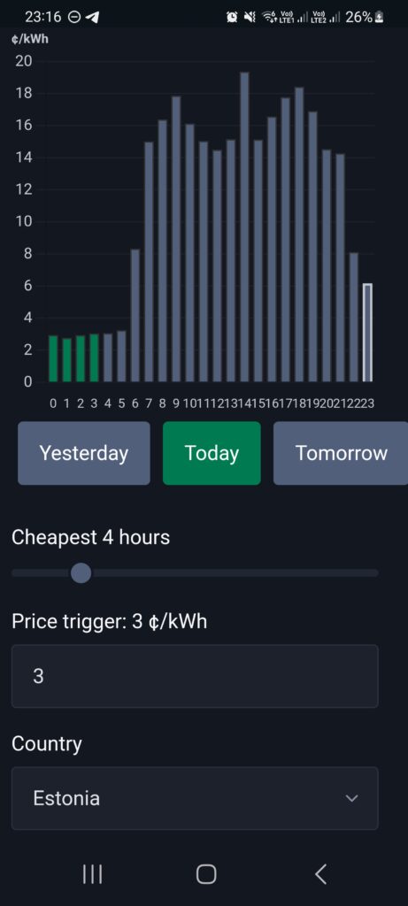 • Pigiausių valandų parinkimas: Pasirinkite tam tikrą kiekį pigiausių valandų per parą (pvz., įjungti 8 pigiausioms „Nord Pool“ valandoms).