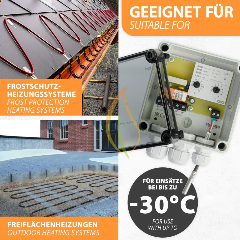 Терморегулятор TEV-1 отличается широкими функциональными возможностями. Он специально разработан для управления электрическими системами защиты от замерзания — такими, как нагревательные кабели для труб, системы обогрева желобов и уличных площадок.