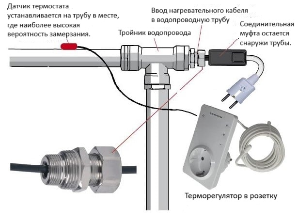 Монтаж внутри трубы: установка греющего кабеля непосредственно в воду на 20% эффективнее наружного обогрева. Для герметичного ввода используется специальная проходная муфта (сальник).