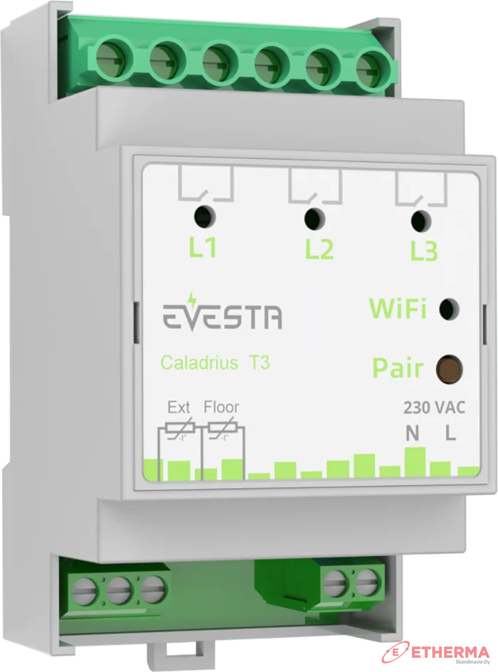 Kolmefaasiline termostaat Caladrius T3 on nutikas temperatuuri regulaator, mis töötab koos Evesta mobiilirakendusega