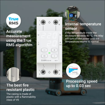 Pingerelee voolukontrolliga DS Electronics ZUBR CV2 kaitseb seadmeid liiga kõrge ja liiga madala pinge, nulljuhtme katkestuse ning samuti liigse voolu või võimsuse tarbimise eest.