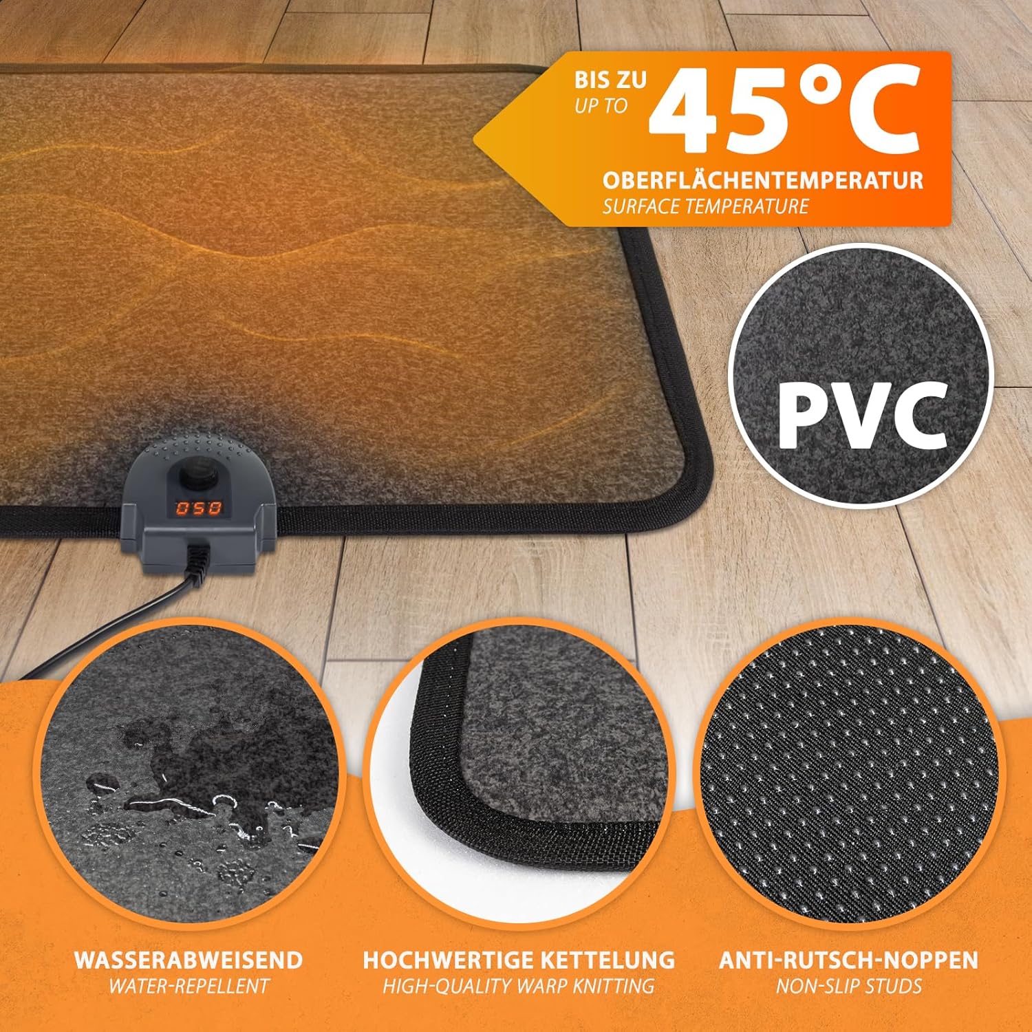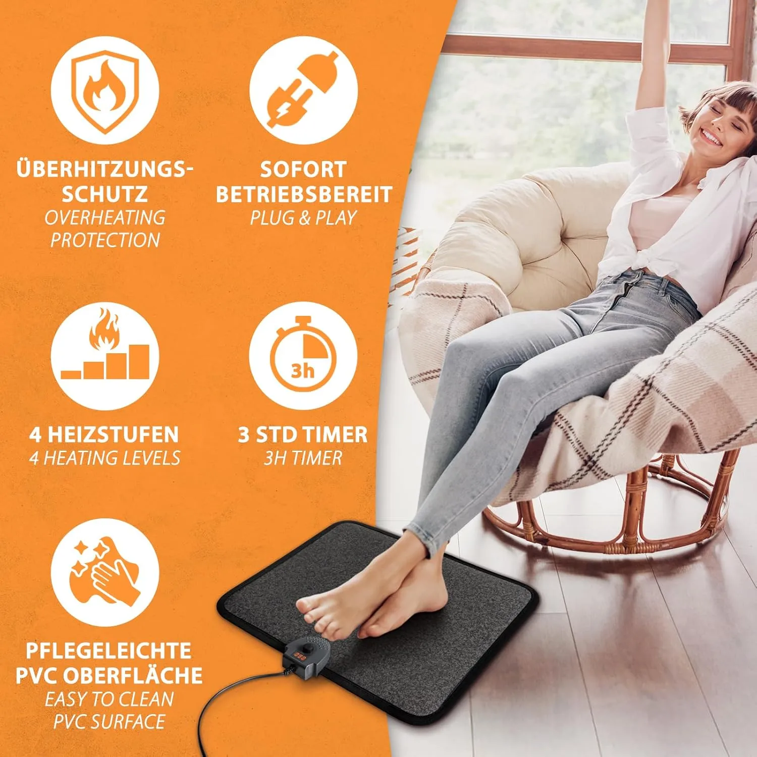 Infrapuna soojendusmatt (40×50 cm) hoiab jalad meeldivalt soojas – ideaalne kodus, kontoris või tööruumis. Jalalülitiga on seda lihtne sisse ja välja lülitada ning 4 erinevat kuumusastet annavad võimaluse valida endale sobiv temperatuur kuni 45 °C. Sobibib ka esikus jalanõude kuivatamiseks. Toodetud Saksamaal