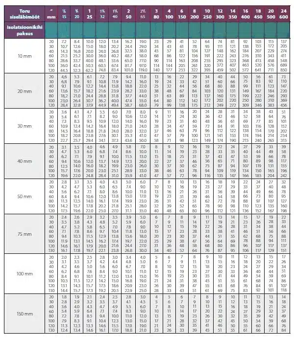 Alljärgnevast tabelist saab näha kui palju lisaks vajab soojendusega toru soojustust külmumise vältimiseks. See sõltub toru läbimõõdust, ümbritseva keskkonna minimaalsest temperatuurist ja küttekaabli võimsusest. Küttekaabli valiku puhul peab tabelis antud number jääma alla kümne. Vajadusel küsige infot juurde.